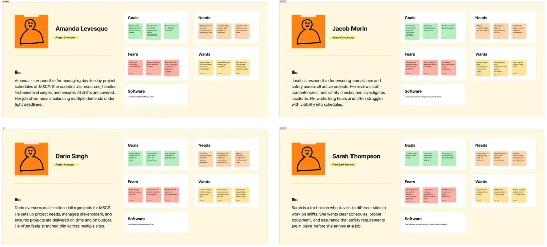Personas capturing the goals and challenges of schedulers, project managers, safety coordinators, and field staff