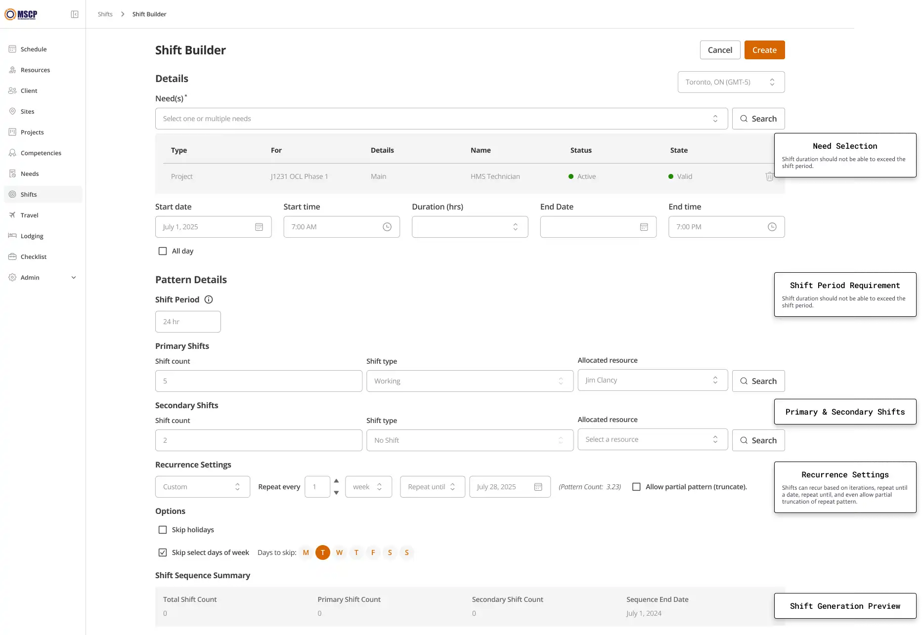 A major challenge was the Shift Builder. MSCP needed to create recurring shifts, secondary shift types, holiday exceptions, and custom ranges. I designed a progressive interface: schedulers could start with a simple shift, and only add complexity if needed. This directly supported our goal to simplify complex scheduling.
