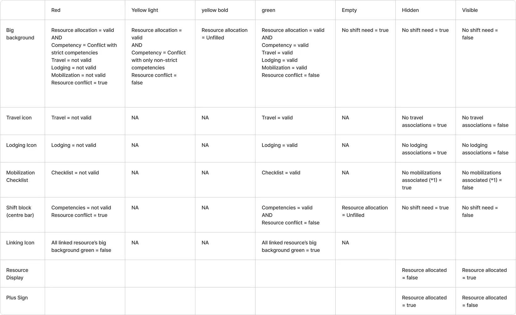 Red: an error that invalidates the allocationValidation worked hierarchically, surfacing errors at the lowest level and rolling them up to shift groups and needs. This directly supported our goal of ensuring compliance visibility, helping schedulers and safety coordinators see issues instantly. By combining drag-and-drop scheduling with hierarchical validation, we reduced the tedium of creating complex schedules while improving accuracy and compliance.